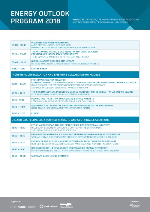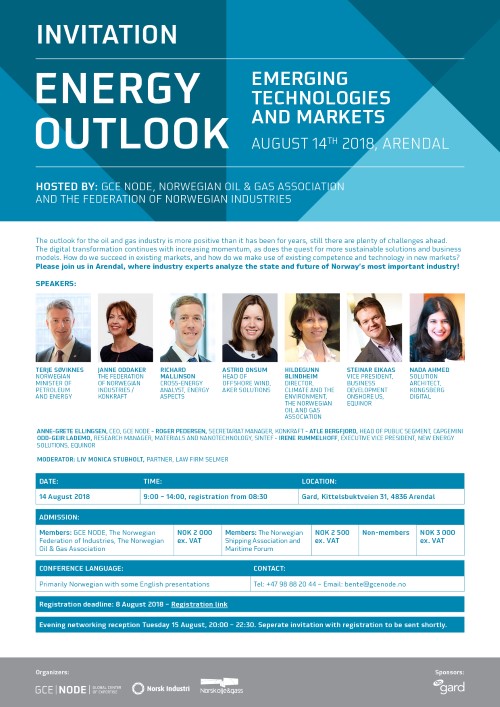 Energy Outlook arrangeres av GCE Node i samarbeid med Norsk olje og gass og Industri Energi. Årets Energy Outlook har fått tittelen Emerging Technologies and Markets.
