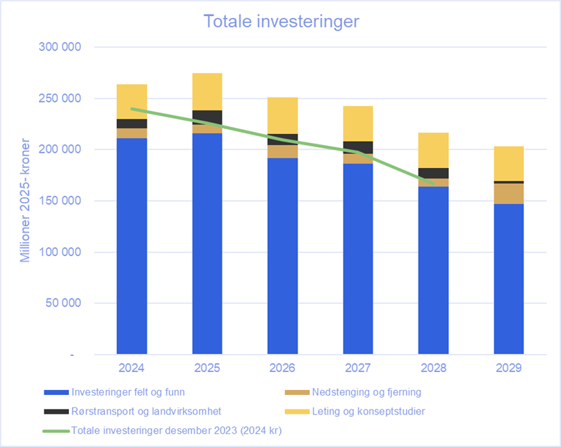 Etter 2024 anslås de totale investeringene å falle gradvis mot 2029. Det skjer i hovedsak fordi prosjekter i igangsatt før 2025 ferdigstilles. Nye prosjekter kan imidlertid løfte anslagene mot slutten av perioden.