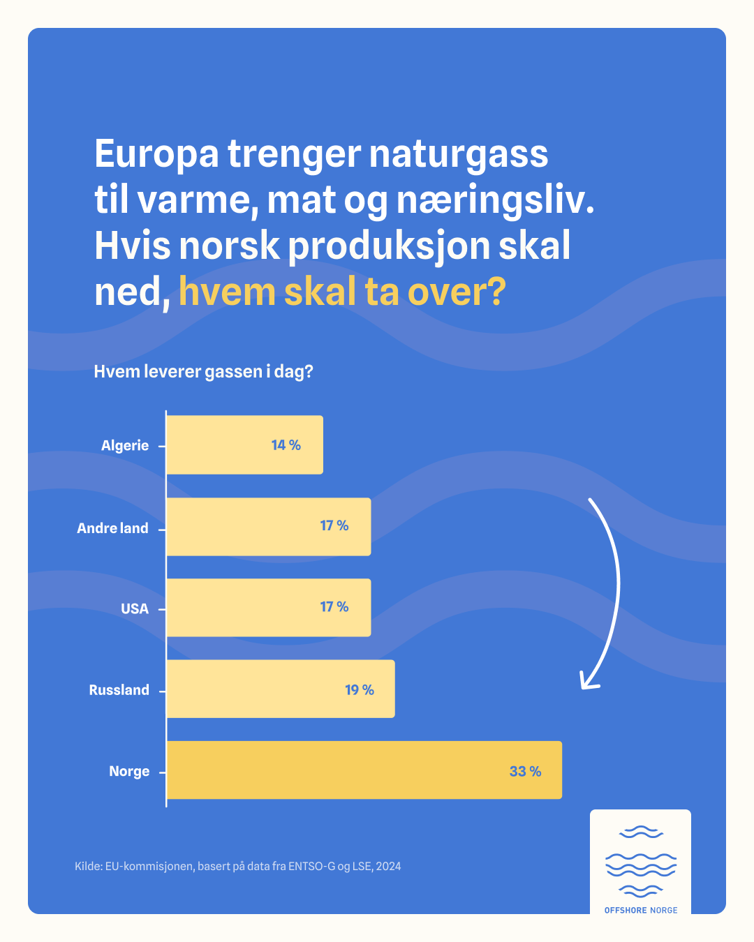 Norge kan være en stabil og pålitelig leverandør av olje og gass med lave utslipp. EU anerkjenner dette, og derfor støtter de videre leting og investeringer i olje og gass på norsk sokkel. EUs plan for utfasing av russisk olje og gass innen utgangen av 2027 peker også på leveranser fra pålitelige partnere som Norge som en forutsetning for at de skal lykkes. Norsk gass vil også være en viktig innsatsfaktor i produksjonen av utslippsfri blå hydrogen.