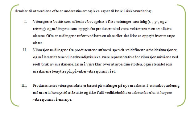Vibrasjonsdata fra leverandører er ikke egnet til bruk i risikovurdering.Verdiene er ofte en underestimering av den reelle eksponeringen en ser ute i felt og kan fører til en overeksponering av arbeidstakerne for hånd arm vibrasjoner (se parentes nedenfor). Flere aktører tar hensyn til denne usikkerheten ved å bruke en korreksjonsfaktor på 1,5 eller 2.